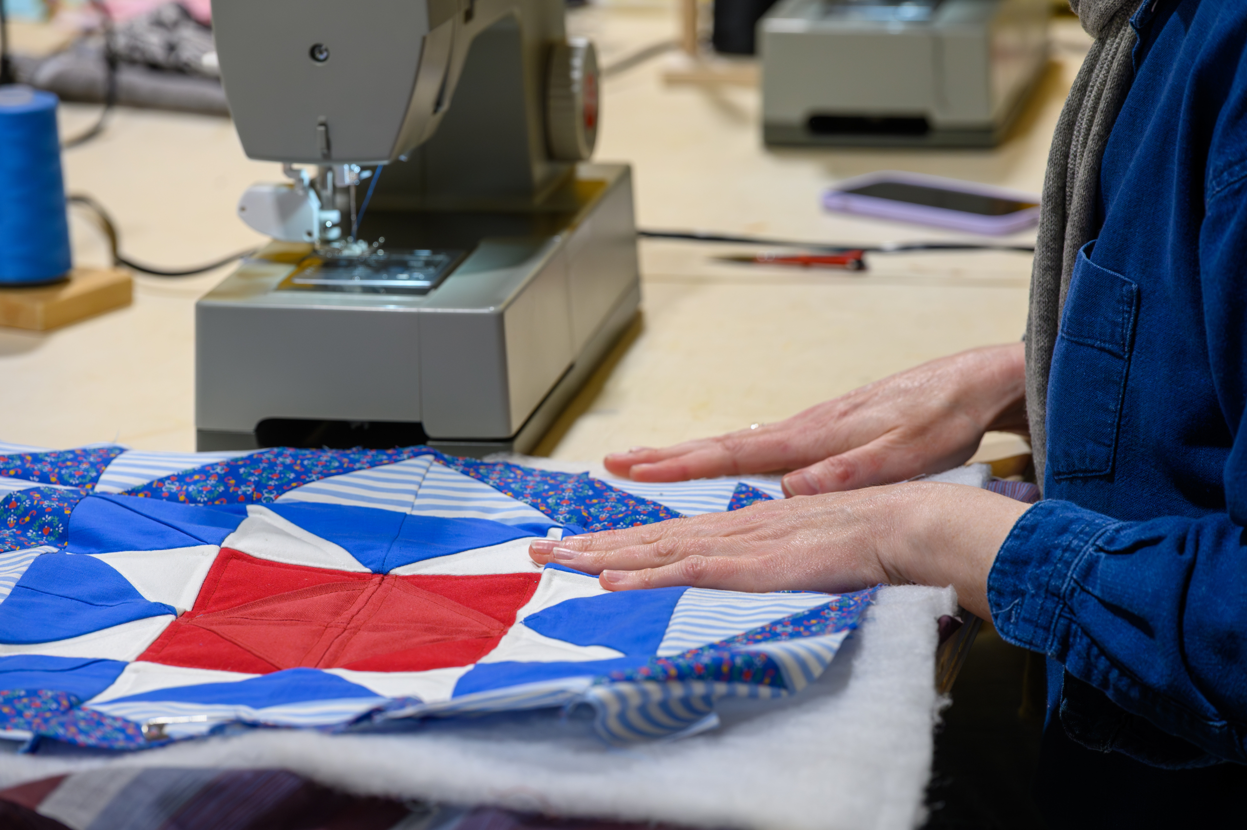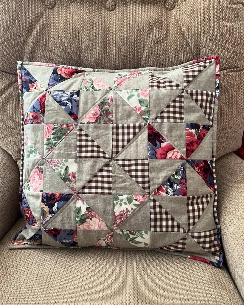 Motif de moulin à vent réalisé avec des chutes de lin d’un autre projet et des pièces de coton vintage.