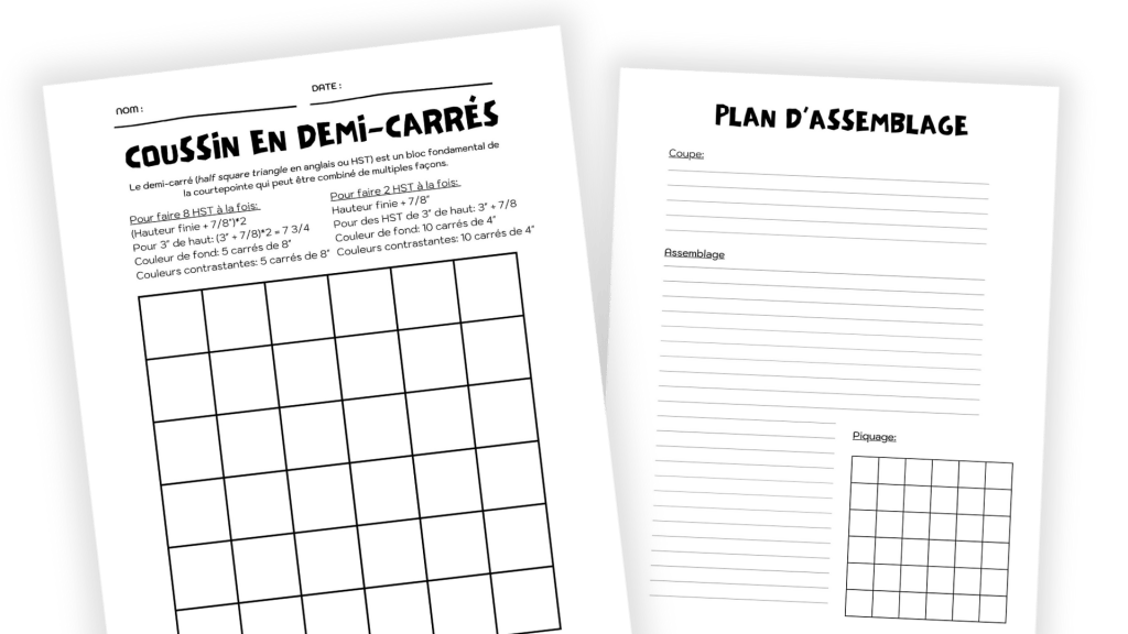 Ce cours offert aux Affutés en deux séances de trois heures est une introduction aux techniques fondamentales de la courtepointe: patchwork, piquage et pose du biais. Les participants sont invités à se saisir du bloc du demi-carré (half square triangle) pour réaliser leur propre disposition et combinaison de couleurs. Une feuille de consignes comportant un plan à colorier leur permet de créer leur liste de coupes et leur gamme d’assemblage personnalisées.